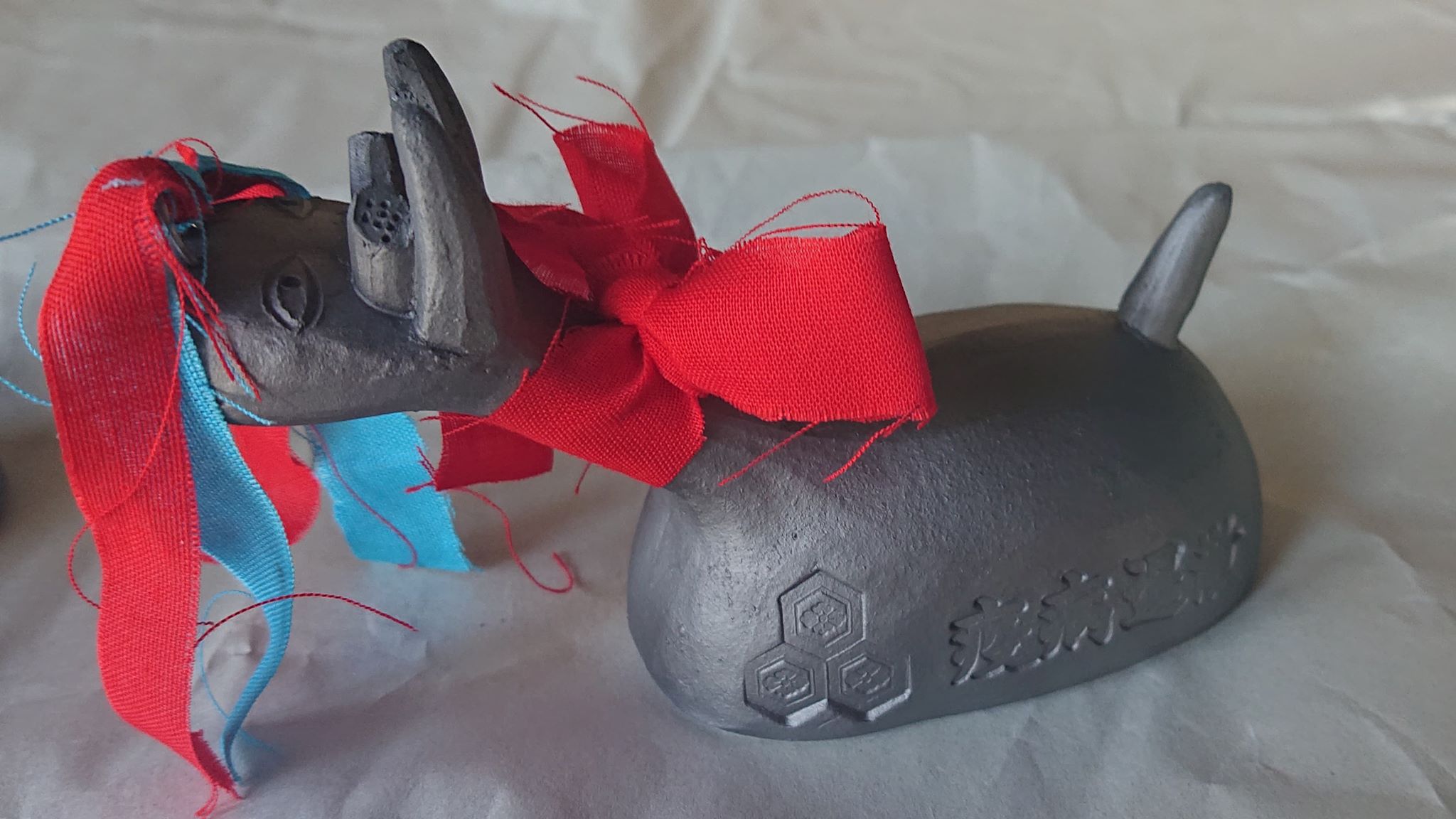 菊間町では少なくとも200年以上の歴史があり、毎年10月の菊間祭において疫病退散祈願をしながら町内を練り歩く牛鬼を菊間瓦で再現致しました。